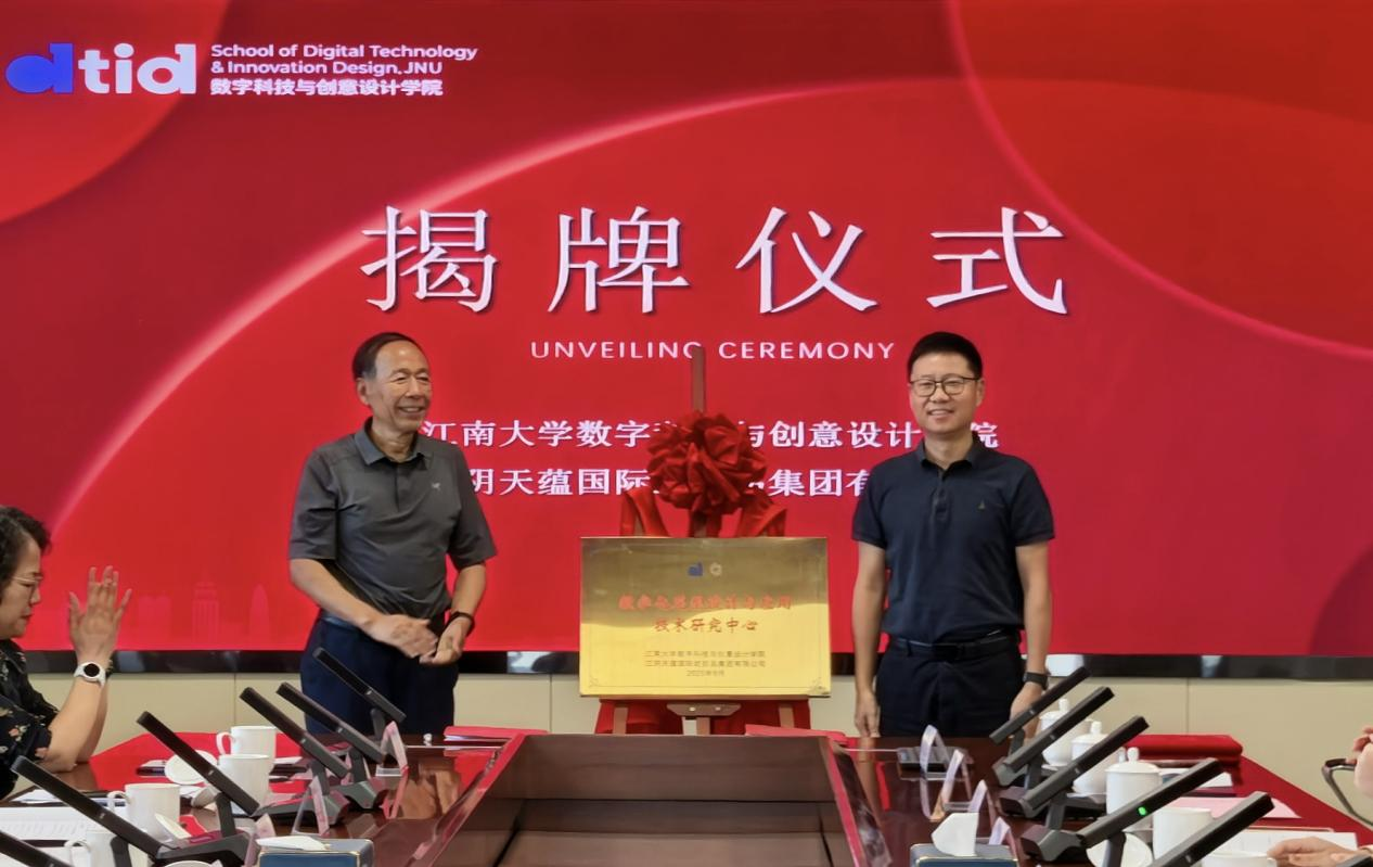 江苏圣澜服饰创意有限公司、江阴天蕴国际纺织品集团有限公司介绍了企业的发展历程、产业优势以及对数字化转型的技术需求,并分别与数创学院党委书记胡振宇为“智能校服技术与文化传承协同创新研究中心”“数字化花型设计与应用技术研究中心”揭牌。