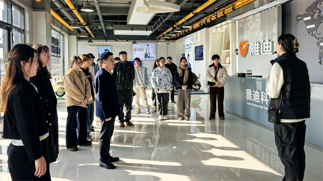 交流期间,在工作人员的带领下,师生首先参观了雅迪展厅,实地了解从早期的经典车型到如今搭载前沿科技的智能电动车,每一款产品都凝聚着雅迪人的创新智慧。师生们边听讲解边驻足交流,对雅迪的品牌实力与发展理念有了初步的深刻认知,直观感受了行业前沿技术与数字创意的融合应用。
