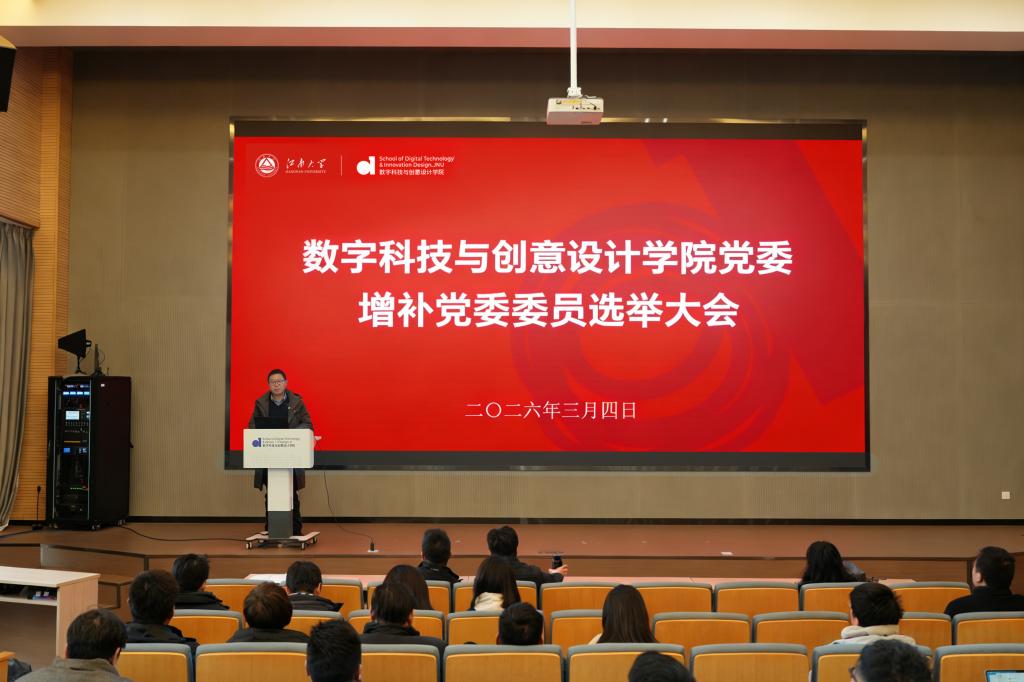3月4日下午,数字科技与创意设计学院召开党员大会,增补选举学院党委委员。会议由学院党委书记胡振宇主持。