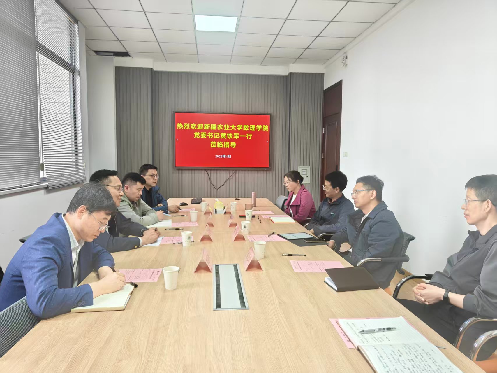 4月8日下午,新疆农业大学数理学院党委书记黄铁军一行到访数学与数据科学学院开展党建、人才培养、学科建设、师资队伍等方面调研。学院党委书记陈勇,副院长陈晶,信息与计算科学系主任过榴晓,办公室主任朱忠明等参与活动。